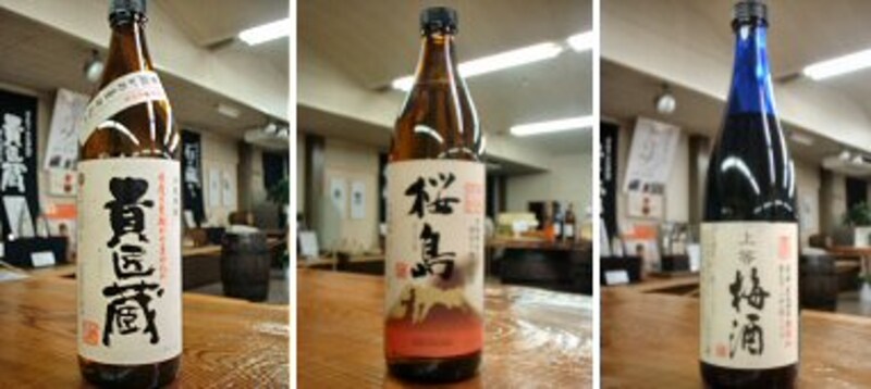 ![]() 貴匠蔵は黒麹仕込み(=左)、桜島は白麹仕込み(=中)、梅酒もおすすめだ(=右) |