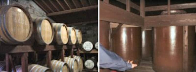 ![]() 樽が静かに眠る(=左)、かめの中でもゆっくりと熟成(=右) |