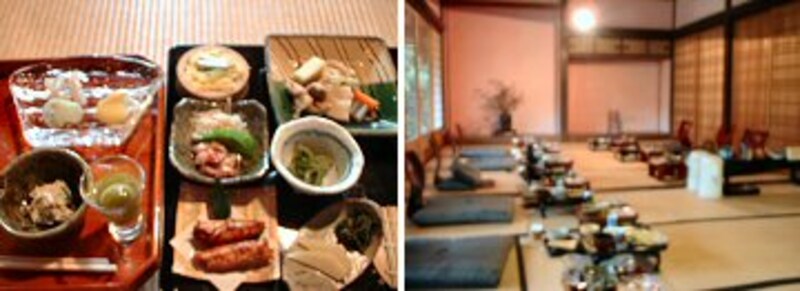 本物の武家屋敷の中で、一人一人高膳で料理を食べさせてくれる。地元で「地酒(じしゅ)」とよぶ米からつくったお酒で味つけする『酒寿司』を体験できる。