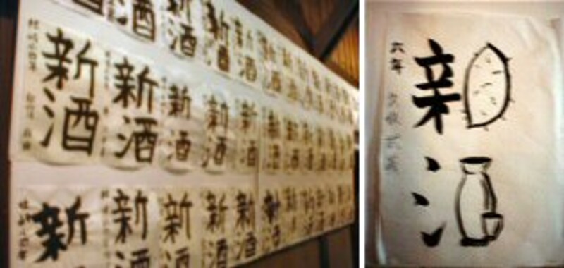 もうひとつおもしろいのは蔵の壁あちこちに地元小学生がかいたお習字が張ってあるのだが、文字はすべて「新酒」。小学生なのに「新酒」だ。