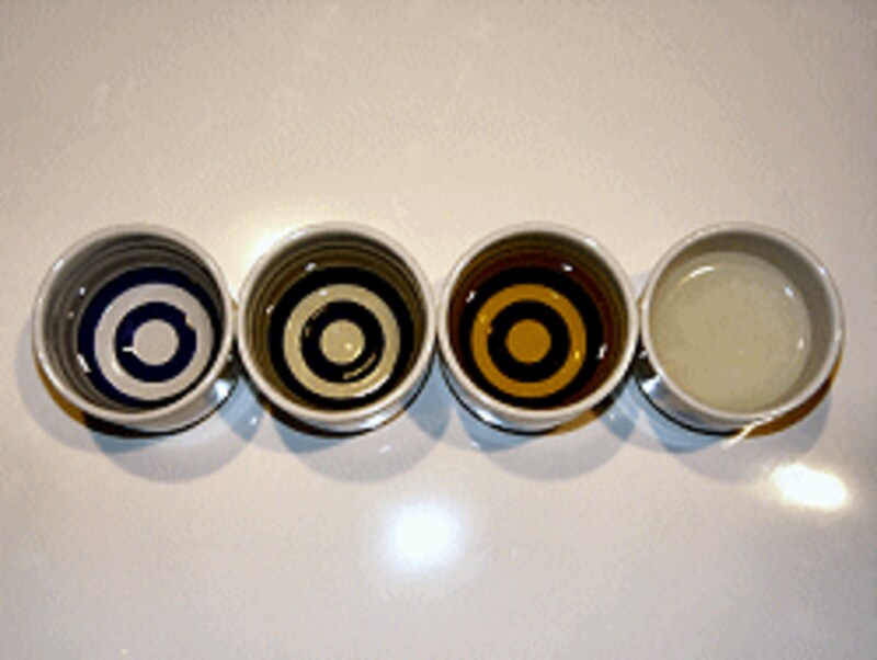 もうひとつは、白いお猪口で、底に青いぐるぐるが書いてあるもの。よく見ますよね?これは、色合いをみるのにぴったり。