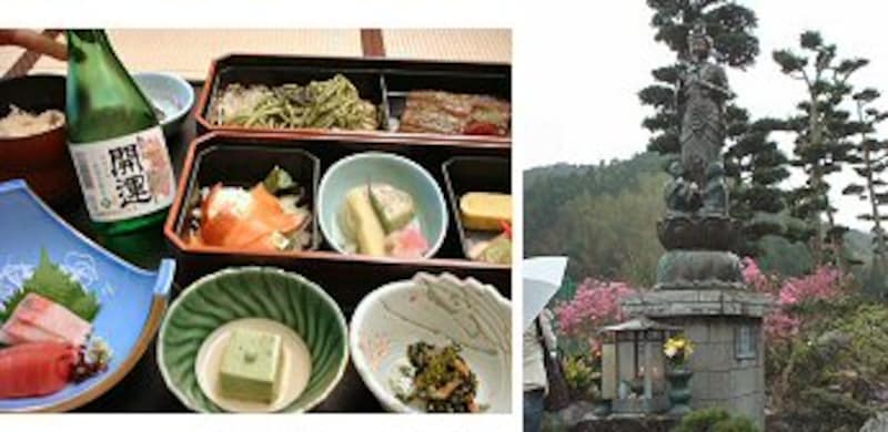 |  お昼の懐石弁当に「生本醸造」がぴったり(=左) 「ボケ封じ観音」観音様の足元にはおじいさんとおばあさんが(=右) |