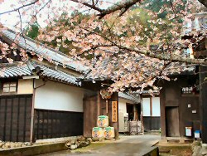 |  黒塀に桜が美しい土井酒造場の門 |