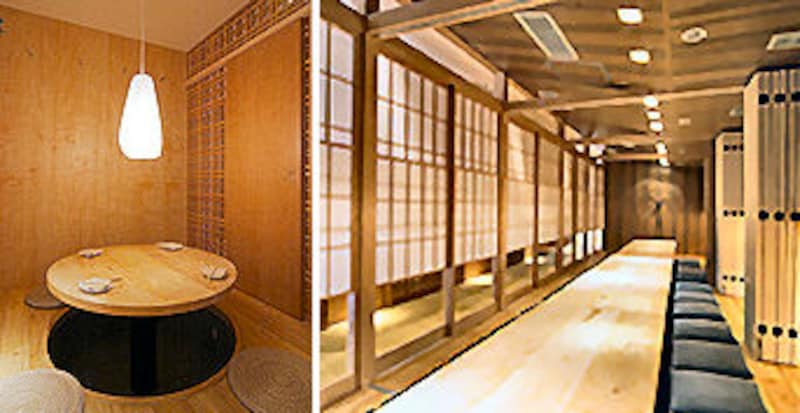 ![]() 大中小の個室は使い勝手がいい(=左)。 仕切りを取れば20数名の個室になる(=右) |