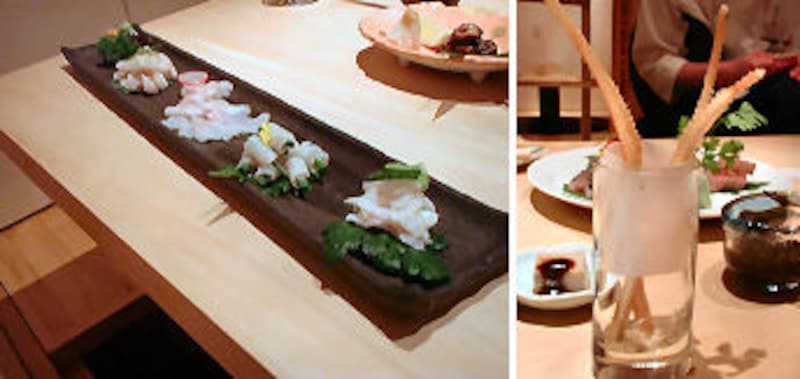 ![]() 穴子のお造り全部盛りは食べ応えあり。 この画像は人気雑誌「PEN」 編集長の作品!(=左)。 繊細で香ばしい穴子骨せんべい。 おいしっ。(=右) |