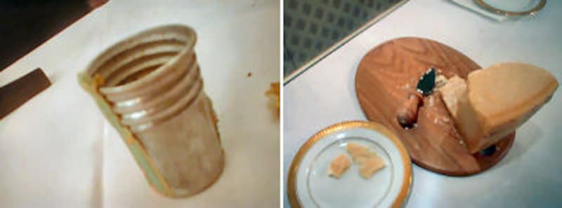 ![]() ボトルの口には、この蓋のようなお猪口のようなものがついている。(=左) 熟成日本酒には熟成したチーズもピッタリ。これはパルメジアーノ・レッジャーノ。(=右) |
