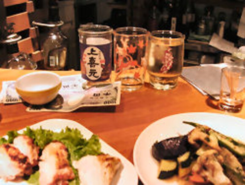 まずは最初に飲みやすいタイプということで山形『上喜元』を注文した。一人だとカップのまま飲むが、二人だと小ぶりのグラスに注いでくれる。おすすめどおりあっさりして最初に飲むにはピッタリ。