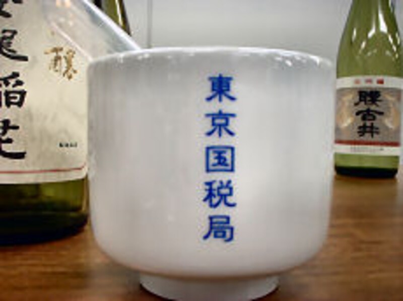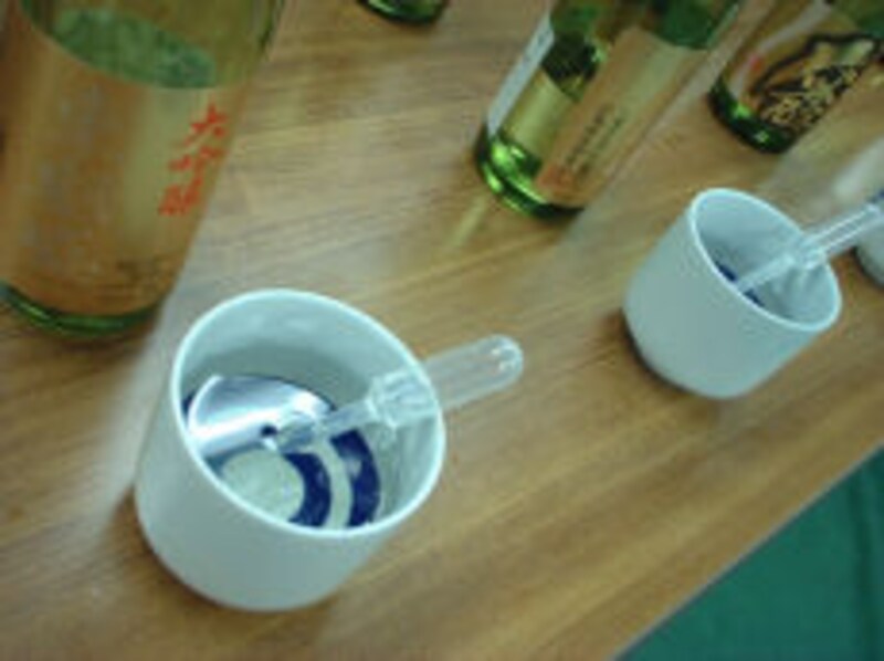 ![]() テイスティングは大きなお猪口に入ったスポイトで各自注ぐ方法。 |
