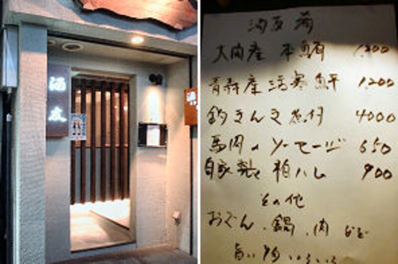 ![]() 入り口はモダン。(=左)、店外には手書きの本日おすすめメニューが。(=右) |
