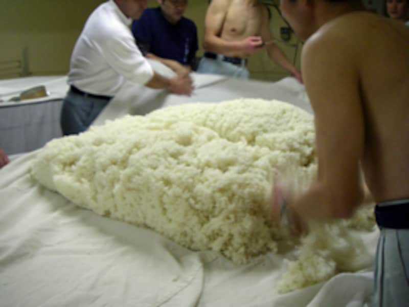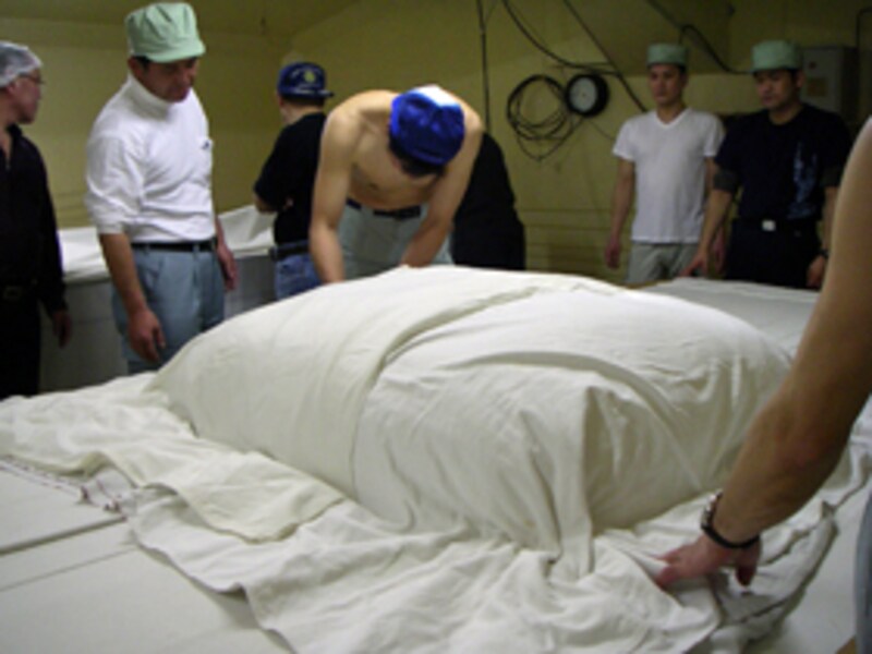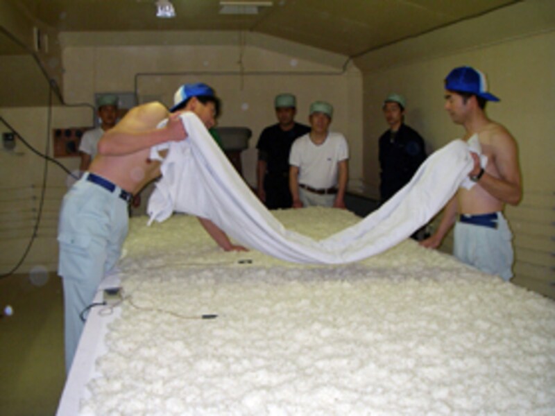 ![]() 大きな布をばさばさしてさらに温度を下げる、麹菌は微妙な温度で繁殖するのだ |