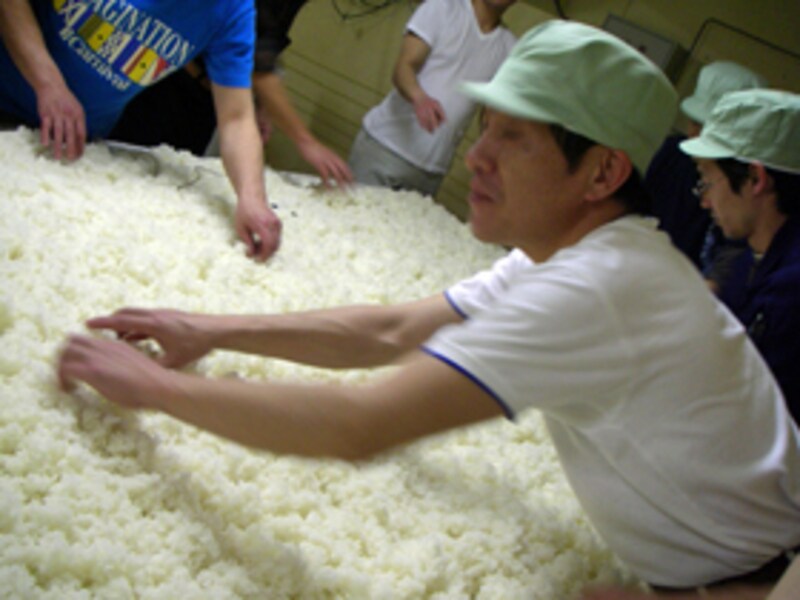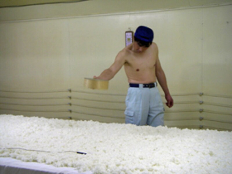![]() ゆっくり丁寧に麹菌をまく。満遍なく広がることが重要。麹は黄麹菌 |