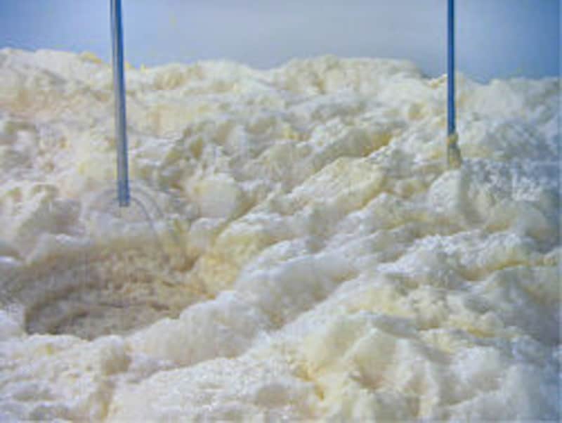 ![]() ごつごつした硬い泡は「岩泡」と呼ばれる。くるくる回る針金で泡があふれ出すのを防ぐ。そのくらい勢いのある発酵中の泡。 |