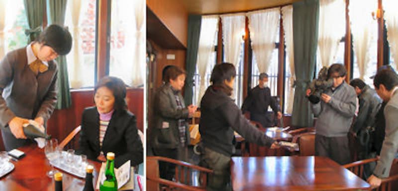 ![]() 社員の方がテイスティングのサービスをしてくださるのもうれしい。(=左)/テレビ撮影の様子。テイスティングルームも素敵なデザインだ。(=右) |