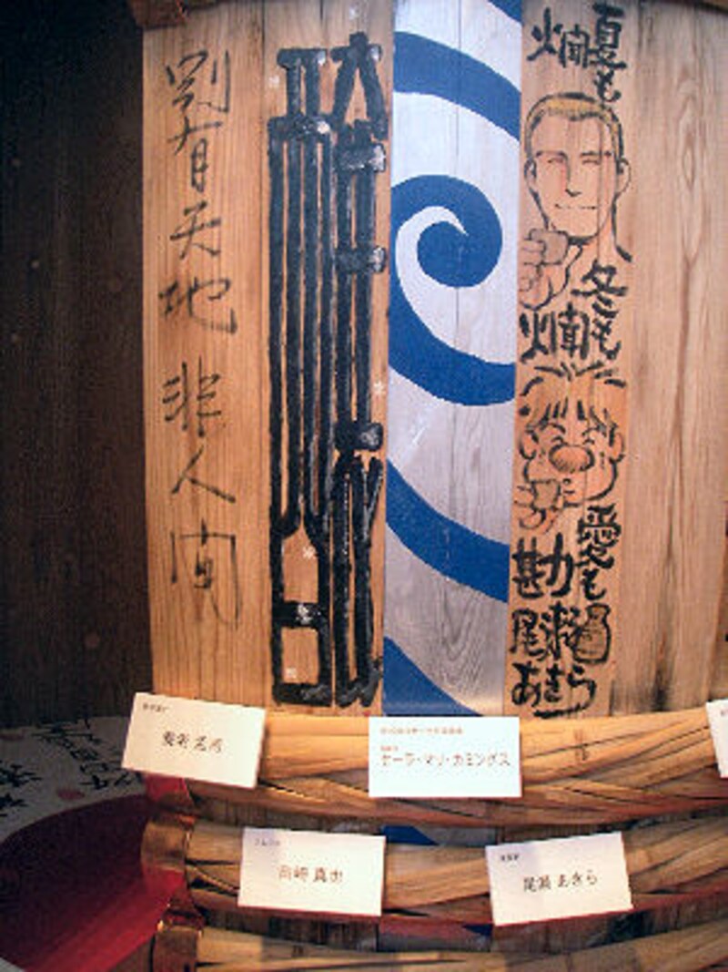 ![]() 桶の木にさまざまな思いをこめた「桶アート」。われらが先輩田崎真也氏のものもある。 |