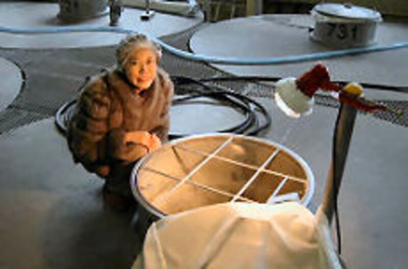 昔ながらの桶仕込にも思い入れがある。左は社長。徹底したクリーン管理だから、ちゃんとヘアキャップもかぶるのだ。