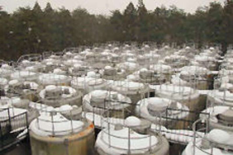 こちらもまたまた巨大な熟成タンクが並ぶ。この日はしんしんと降り積もる雪に覆われていた。