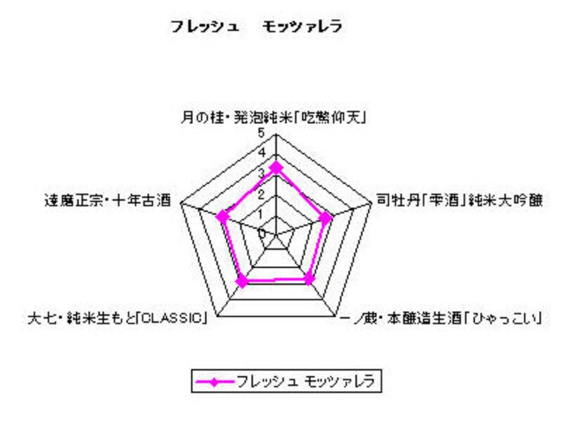 大吟醸のフルーティーさや華やかさが目立ち、香りが高すぎて、チーズの風味がかきけされてしまう。モッツアレラのクリーミーさが楽しめるが、お酒の一人勝ちの印象。
