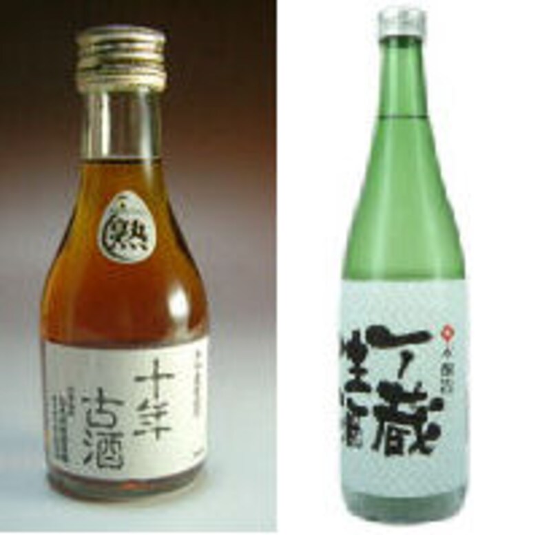 |  あめ色になった十年古酒。ますます注目の熟成酒だ。(=左)、一ノ蔵・本醸造生酒「ひゃっこい」(=右) |