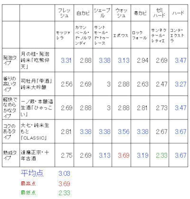|  《注》「日本酒&チーズ・相性研究会」参加者(酒類ジャーナリスト、ワイン醸造技術研究者、チーズ専門家など)16名を対象に実施。清酒五種とチーズ七種を用意し、スコアリングで相性をチェックした。相性評価は5段階評価(1点=不適合、2点=やや難あり、3点=良い、4点=かなり良い、5点=最高の相性)で採点し、その平均値を算出した。 |