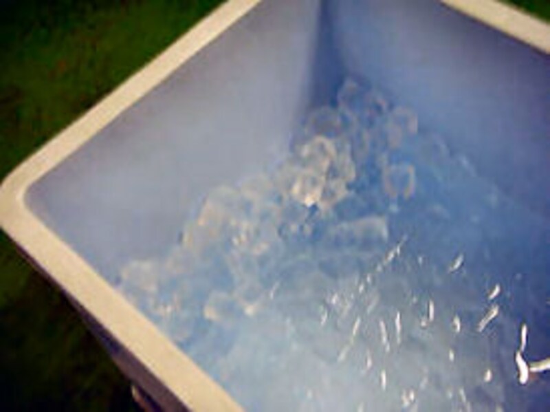 タンクに巻きつけてあるビニールシートの中は、氷! 暖冬なんだな。