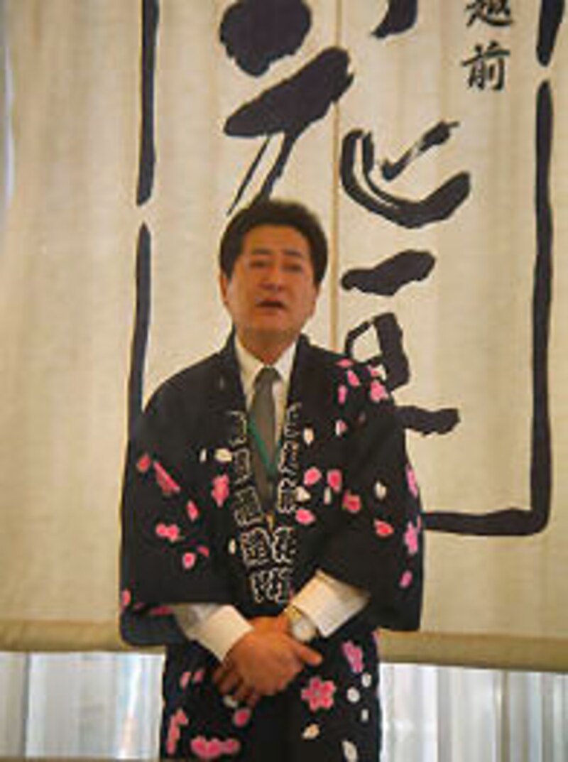 酒蔵と大野市をご案内いただいた南部社長。花柄のはっぴが印象的♪