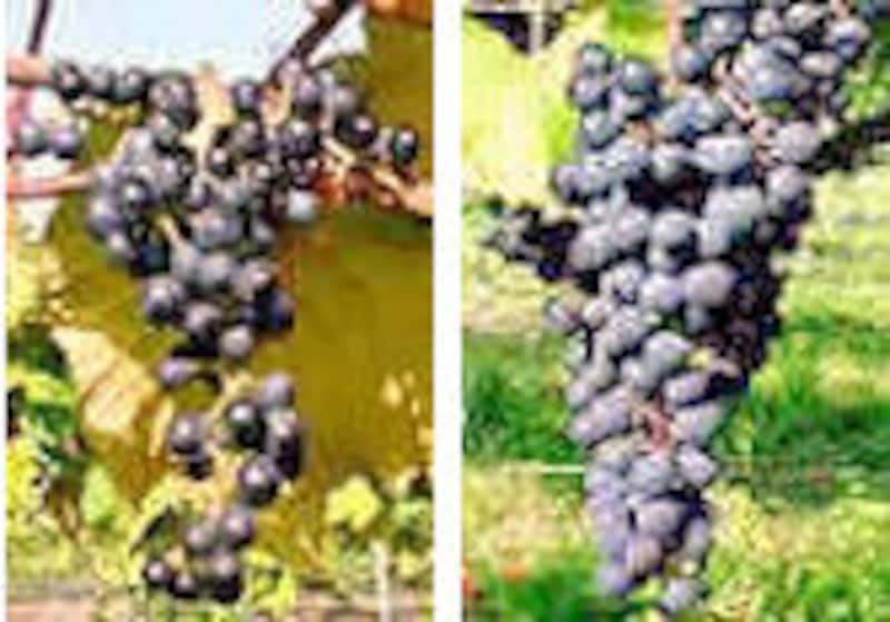 ![]() やまぶどう。ばらばらと実がつくのが特徴だ。(=左) 最近注目の「小公子」という名前のぶどう。(=右) |