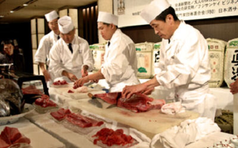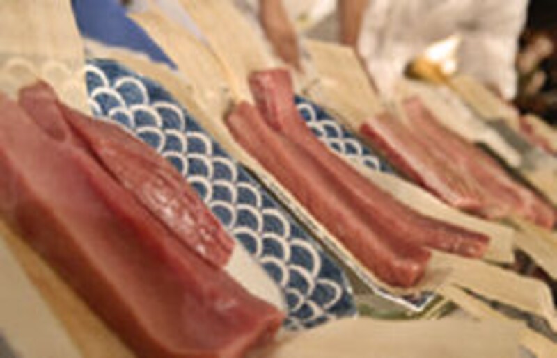 ![]() 大盛り上がりのマグロ解体ショー。見事な裁きはホテルの料理長。 |