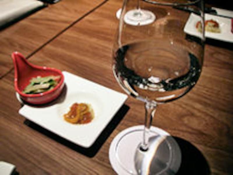 この日の限定日本酒は「黒龍 大吟醸」。グラスは大振りのワイングラス。