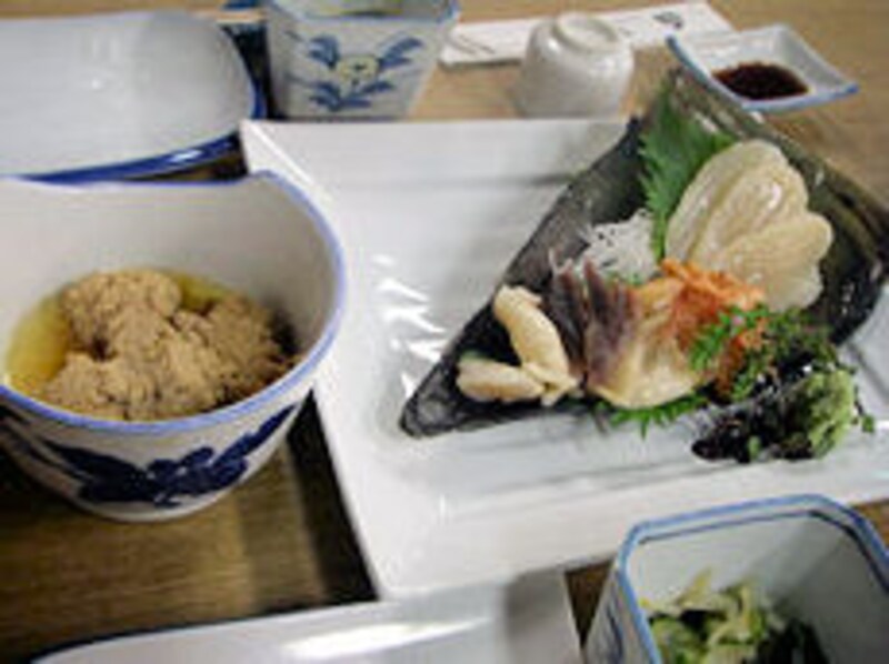 「貝はいいものを入れてるのよ。ほら、この切ったところね、角が立ってるでしょ。これは新鮮な証拠。生酒にはよく合うわよ。付け合せの海草も食べてね。ビタミン豊富で体にいいから」