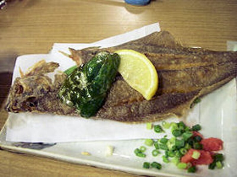 カリッとさくっとしたカレイの唐揚げ、ヒレも美味しい。