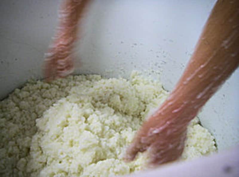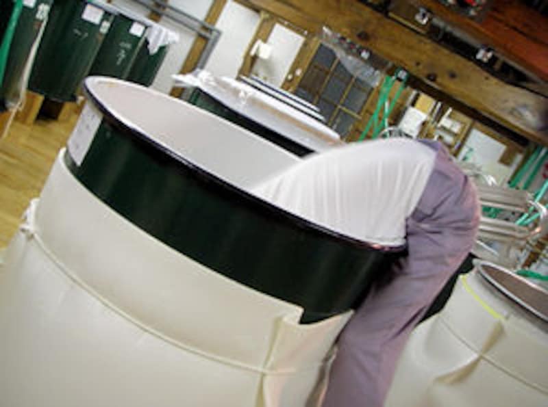 タンクの中に入り込むようにして酒母を混ぜる。体力がいる仕事。