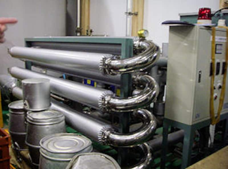 一瞬にして温度変化が出来る冷却機。8000リッターを1分刻みで5度→63度→10度にできる。
