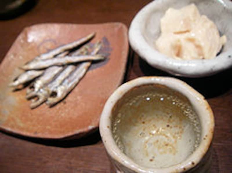 お酒がいいうえに、つまみ類が、もう、感激の品ばかり。おひたし200円、たこの粕漬け、ねぎかつお、うるめいわし、ごま豆腐、もろきゅうが300円。あま鯛の干物、紅豆腐、いかの塩辛(季節限定)が400円、板わさ、生ハムが600円、さいぼし(桜肉の燻製)、からすみが700円。あとは季節の肴に焼き銀杏、煮物、ねぎ焼き、お漬物・・・なども400円~600円程度で揃う。