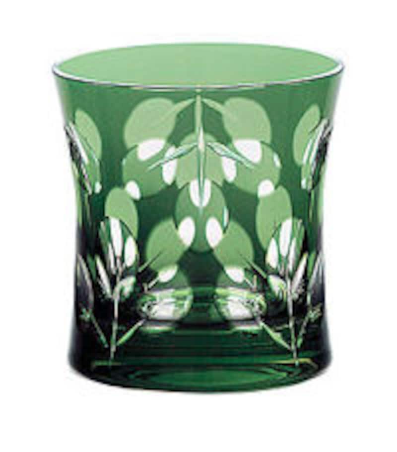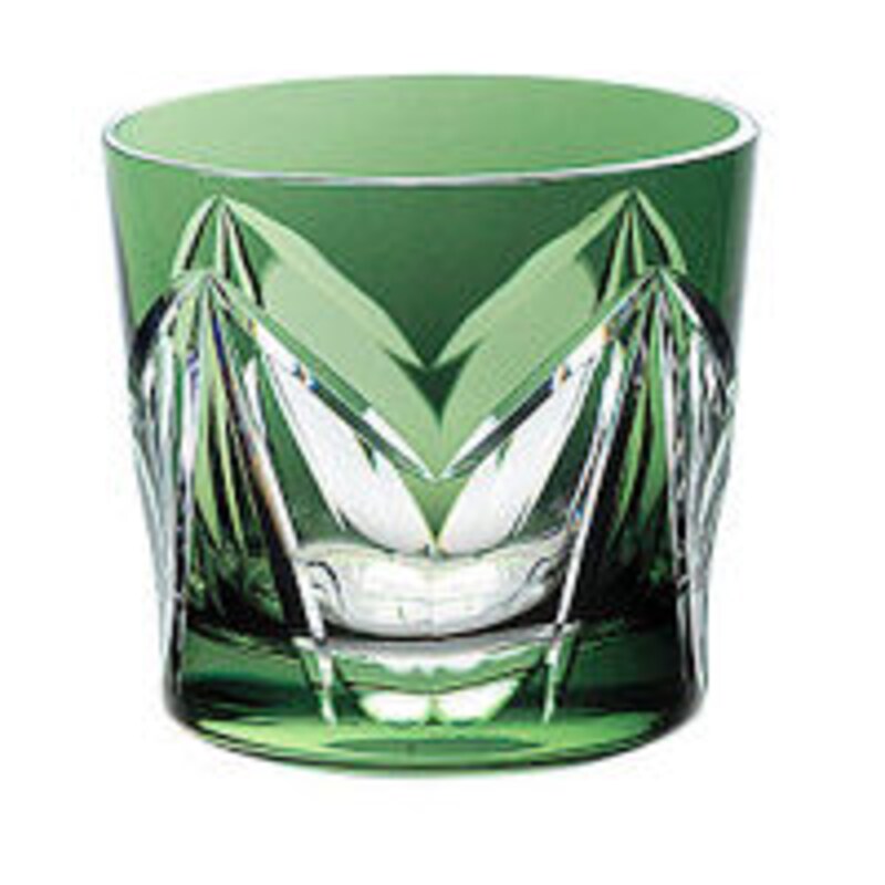 ◎古来から日本の伝統柄とされている植物柄を、千歳緑色のグラスに表現したもの。重なり合った濃淡が、陽光に照らされた森の木の葉のようで美しい。