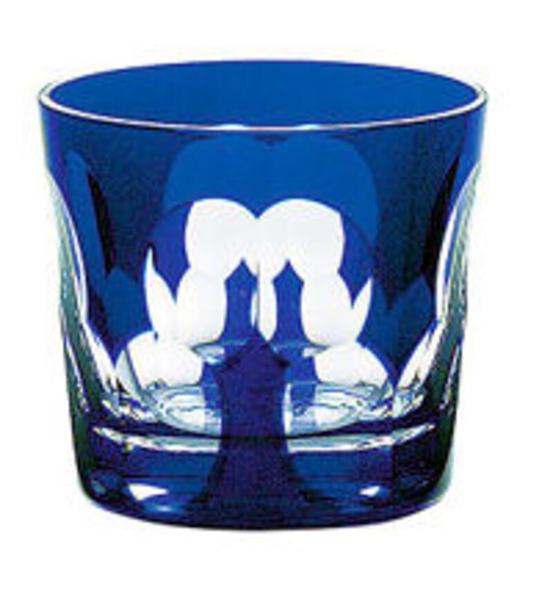 ◎仙人の住む蓬莱島をかたどったとされる縁起のよい文様を、深い海を思わせる瑠璃色のグラスに描いたもの。クリアな瑠璃が際立つタイプ。