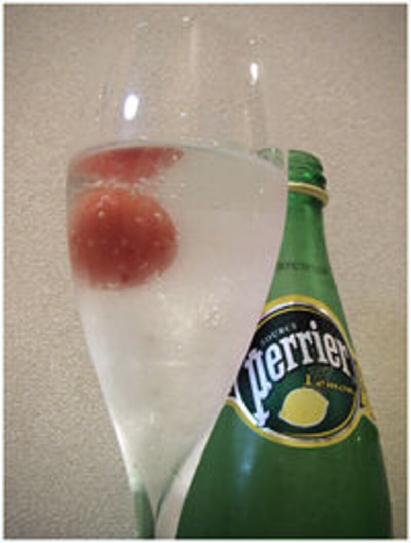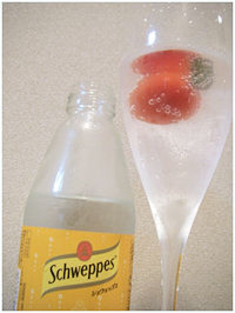 | プチトマトの周りに泡がついて浮いたり沈んだりする。 | トニックウォーターならちょっぴり大人の味に。 |