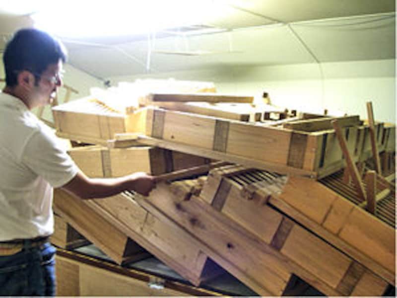 | 麹蓋(こうじぶた)。酒造りの要である麹米を造る箱状の道具。三宅さんたち蔵人の経験から生まれた手作りだ。 |