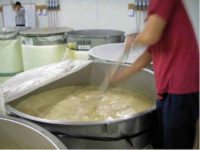 一次もろみが発酵中で、従業員の方がもろみをかき混ぜている。タンクを覗くとぶくぶくと泡が立ち、フルーティーで甘い香りが立ち上ってくる。櫂入れは結構な重労働だ。