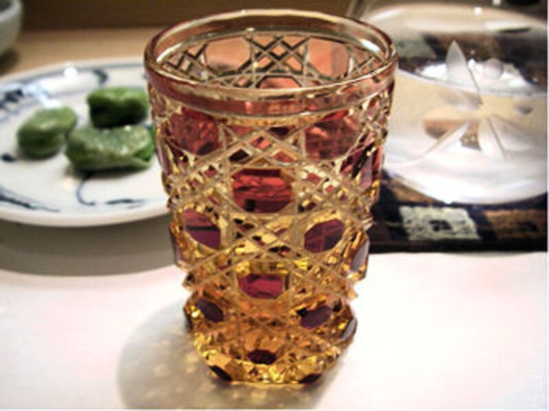 | すばらしい色合いの切子でまず冷やをいく。 |