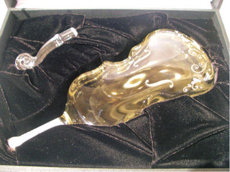 | 透明なバイオリンボトルが、長い間の樽熟で生み出される美しい琥珀色を際立たせる。 |