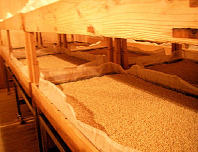 | 手造りで作業を行う麹室。部屋の温度は35度。すべて二条大麦「ニシノホシ」だ。 |