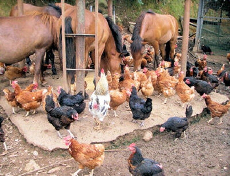 | 「甦る大地」の飼料を食べている「山林放し飼い」する黒岩牧場の元気な鶏たち。なぜか馬も共同生活している。 |