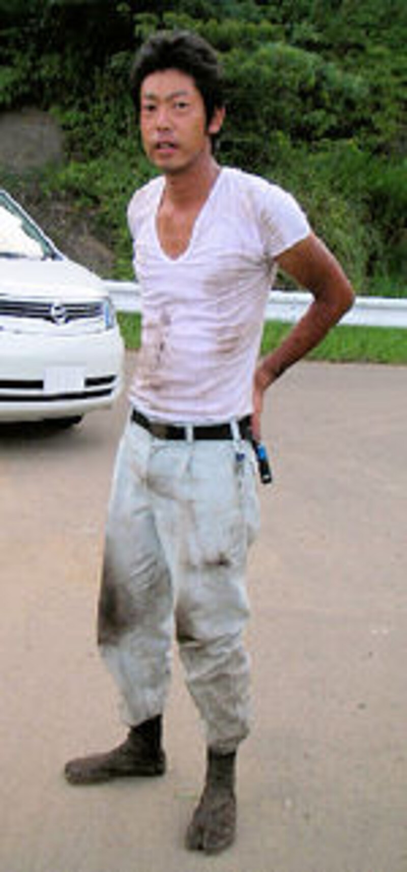 | 畑作業の途中でお目にかかった黒木本店5代目26歳。甦る大地の会のメンバーでもある。土にまみれていても実にカッコイイ青年なのだ。 |