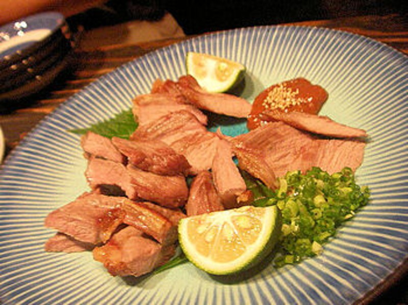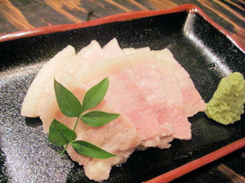 | おつまみは、なんといっても、例の「甦る大地」の飼料で育てられた黒岩牧場「山林育ち尾鈴山鶏」だ。臭みがなく、品のいい甘味とじんわりと染み出てくる旨味が後を引く。 |
