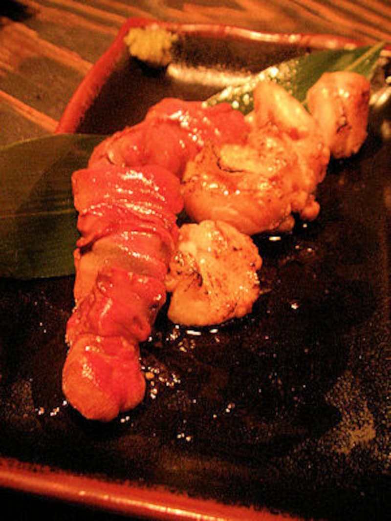 | ご存知、宮崎名物地鶏の炭火焼。堅すぎず柔らかすぎない尾鈴山鶏。ちなみに、黒木さんたちは「ゆず胡椒」を使わないとか。「みんな同じ味になるし、僕らは昔から使わない」と。なるほど、私も、塩辛いところが気になるなぁと思っていたのだ。 |