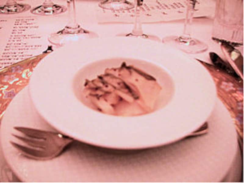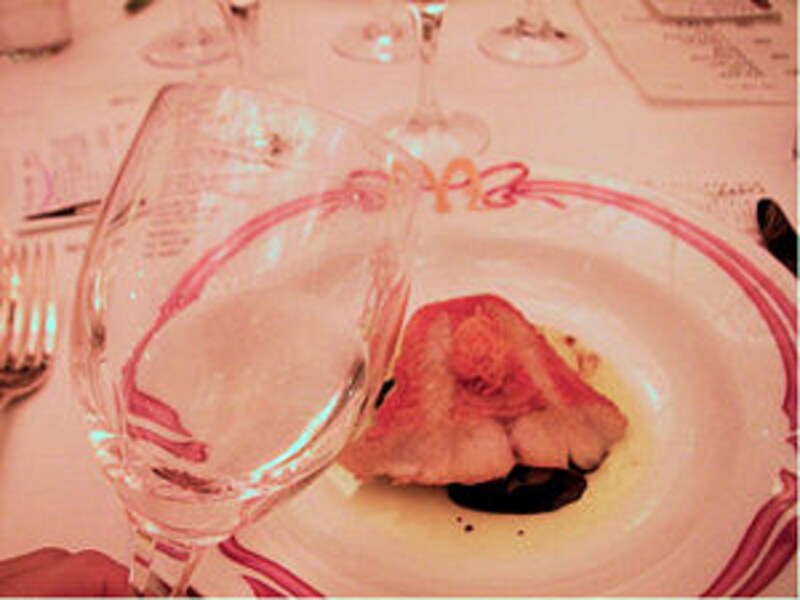 スープはご存知桑名の蛤を使った「蛤のクリームスープ クレソンの香り」。これはやっぱり同じ桑名の「青雲 大吟醸」にしよう。爽快な香りとややコクとボディーのある酒質に滑らかなスープが口の中で気持ちよく交じり合う。清酒は汁物(といっていいのか)にもぴったりくるお酒なのだ。