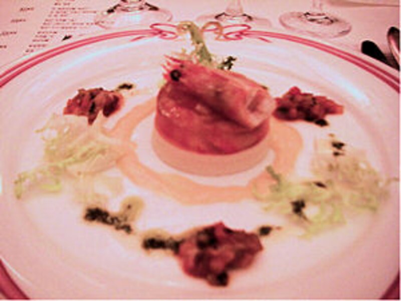 つづいて「宝海老と甲殻類のムース 冷製ジュレ寄せ」。ぶりっと歯ざわりが感じられる甘味のある海老と濃厚なムースのコンビネーション。なめらかさと適度なコクがある「半蔵 純米大吟醸」を。海老の甘味を生かし、料理とお酒の両方のクリーミーさが生きてくる。