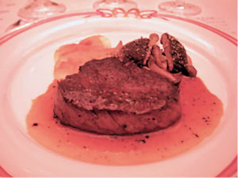 上品な清酒の香りが生きた「雅の智」のグラニテのあと、お待ちかねの「松坂牛のポワレ、トリュフ・フォワグラソース 各種きのこを添えて」である。はい、ソース・ペリグーですね。基本的なフレンチだ。本日のお肉はA4の脂身の少ない部分。コレ正解。そのソースならあまり霜降りすぎるのはよくない。柔らかく旨味十分のお肉には、「参宮 後継ぎの酒 雄町 無ろ過生」のしっかりボディーのあるタイプを合わせよう。