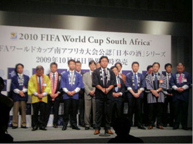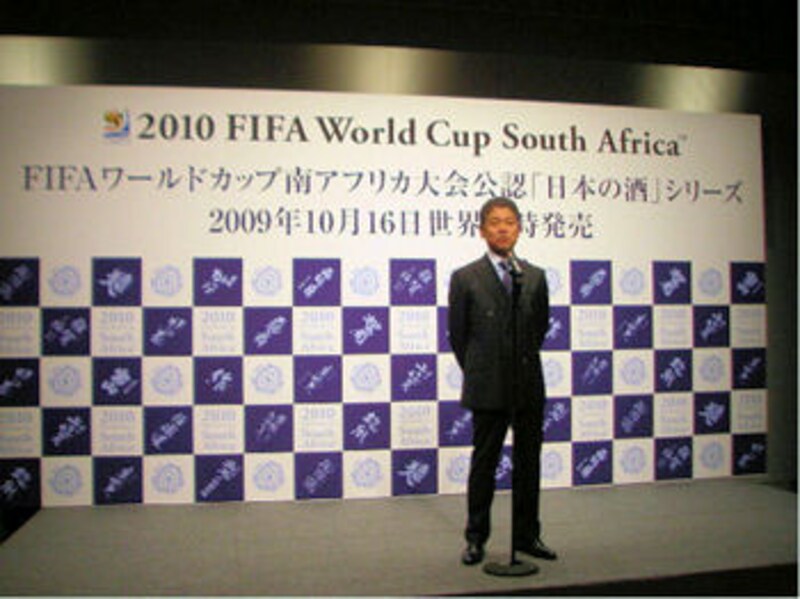 | 10月16日行われたFIFA公認日本酒・お披露目試飲会で挨拶をする長谷川社長 |