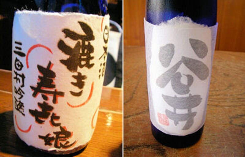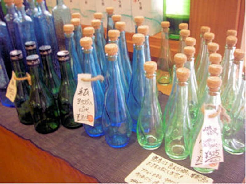 | ボトルはこちら。サイズも形も金額もいろいろあるのがうれしい。ラベルもいろんな大きさの越前和紙に、オリジナルで書けるようになっている。 |